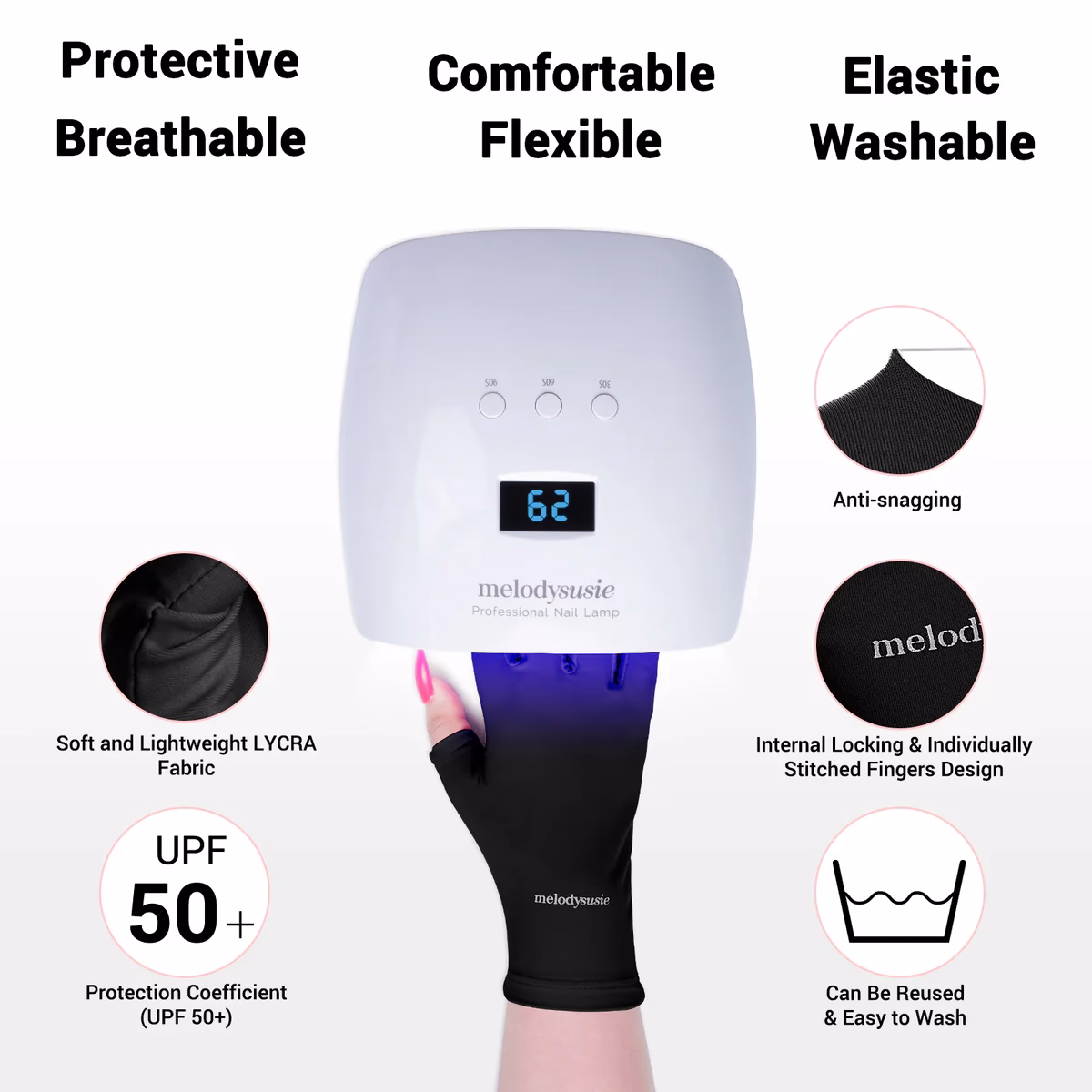 Rokavice učinkovito blokirajo več kot 99 % škodljivih UVA in UVB žarkov, ki nastajajo pri UV/LED lučkah za nohte, ter pomagajo preprečevati prezgodnje staranje kože, pigmentne madeže in poškodbe kože.
